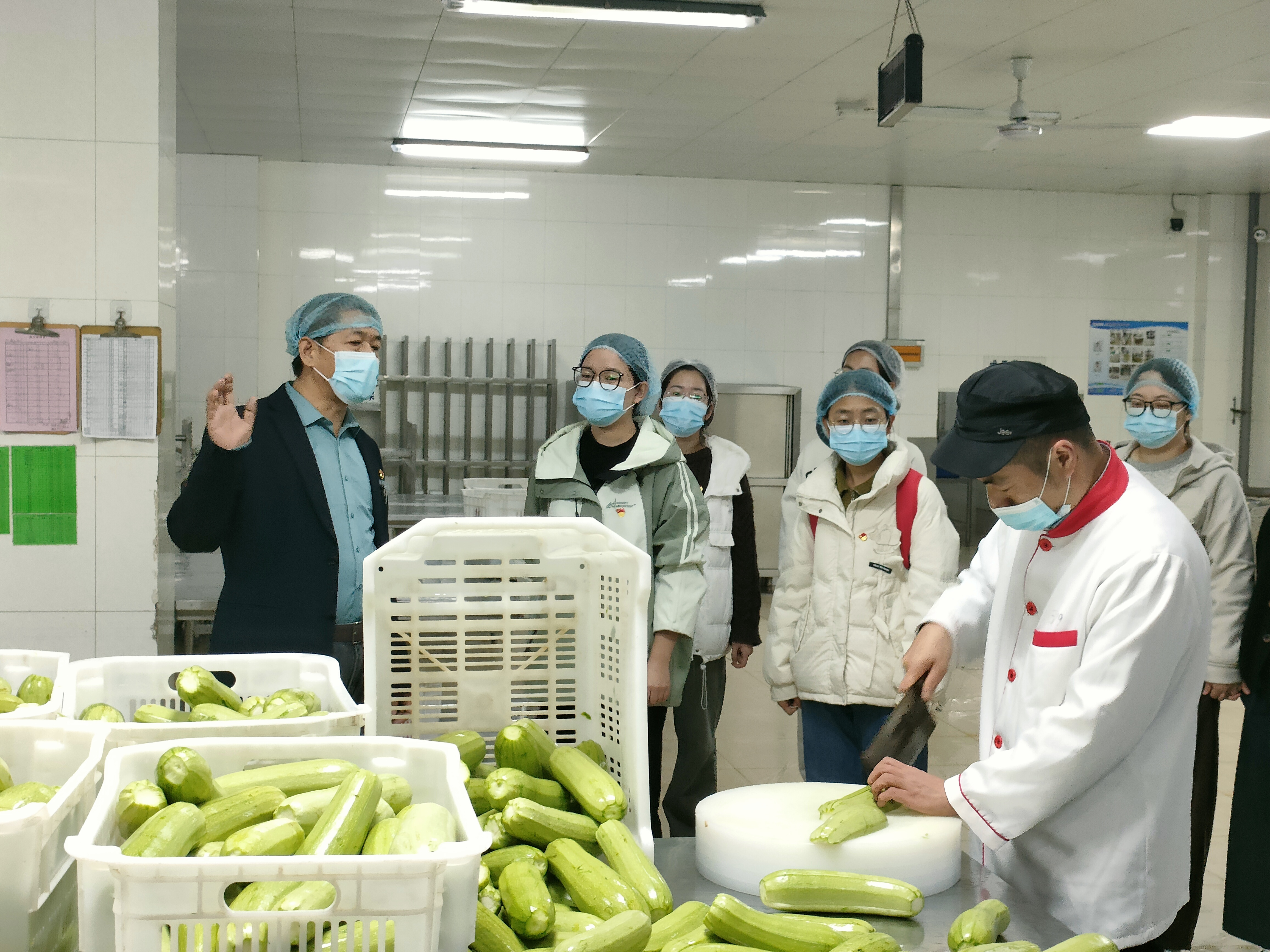 为了让同学们更加直观地了解公司食堂的运作情况,饮食采供党支部带领员工党支部参观了食材储存区、加工区、烹饪区、洗消区等功能区。通过参观,同学们深入了解了食材的采购、储存、加工以及菜品制作的全过程,并对食堂的卫生管理、菜品质量保障等方面有了直观的认识。